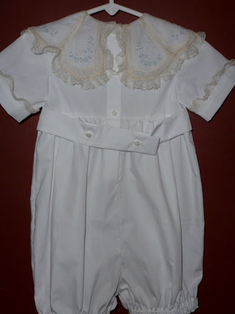 This Boy’s Easter suit/romper was made for a nine month old boy. The suit was created from Pima broadcloth and the collar from Swiss batiste. I used the Cherry Williams Baby Romper and Jumpsuit pattern with a few modifications for the suit itself. The collar I designed using Sarah Howard Stone, Inc. Basic Square Yoke Dress pattern as my basis for the design and adjusted the seam allowances and the neck circumference to fit the Cherry Williams pattern.